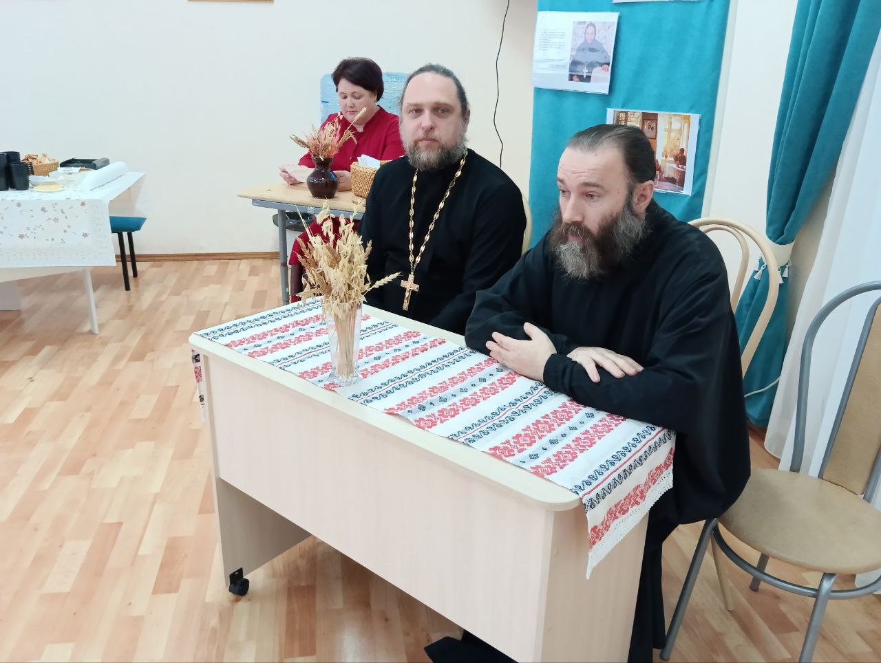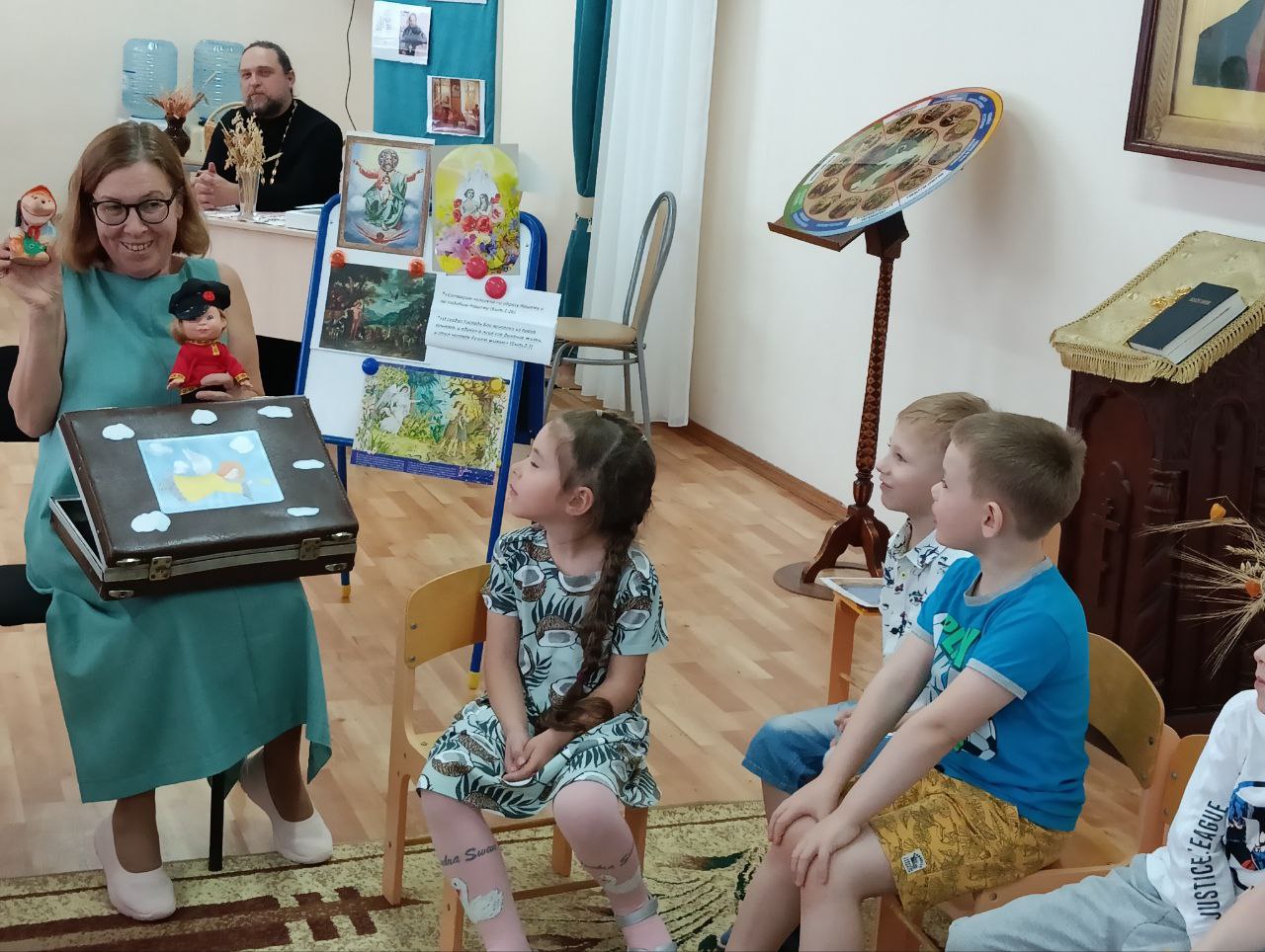Древлехранитель Пермской епархии диакон Геннадий Вихарев в своем выступлении обратил внимание на то, что не всегда этнокультурный компонент отвечает задачам духовного и нравственного воспитания. Тема оказалась очень насущной и неисчерпаемой: к чему из многообразия этнического наследия можно и важно приобщать детей, а что способно и навредить им?Далее мастерскую продолжили практические выступления. Открытое занятие для детей 6-7 лет «Лента времени» представила Кошелева Татьяна Геннадьевна, преподаватель православной культуры детского сада «Гнёздышко» при Православной гимназии.