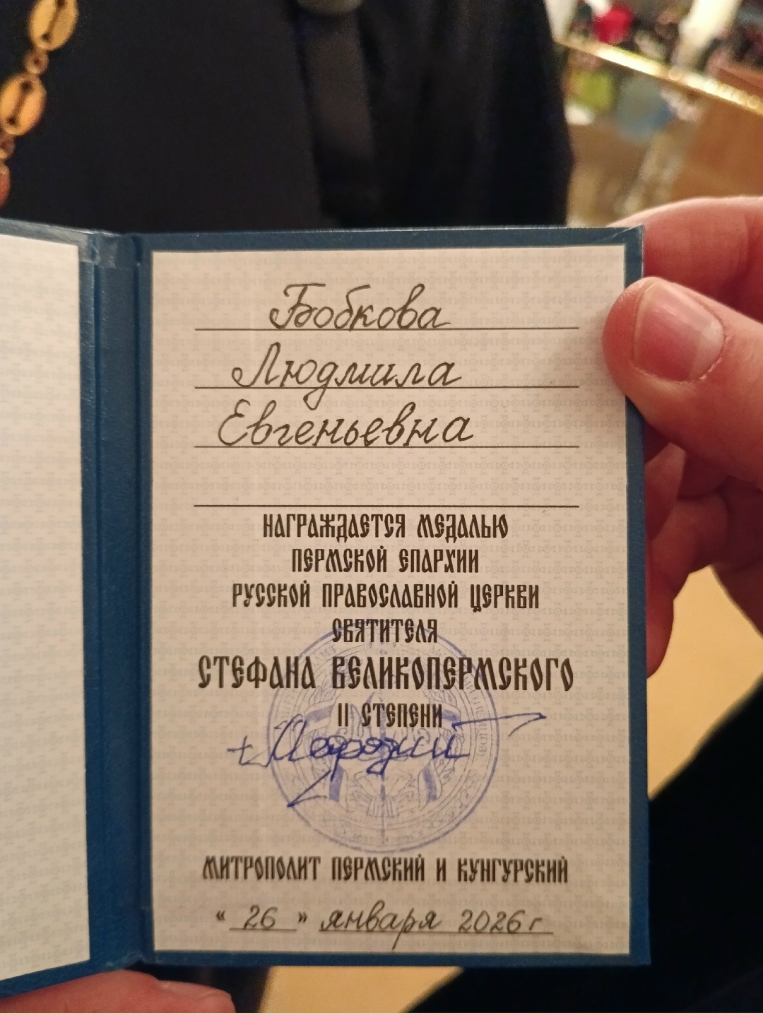 26 января по благословению Высокопреосвященнейшего Мефодия, Митрополита Пермского и Кунгурского, в день своего юбилея, методист отдела образования Пермской епархии Людмила Евгеньевна Бобкова награждена медалью свт. Стефана Великопермского 2 степени!